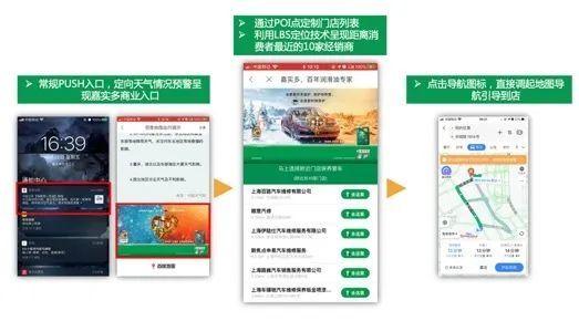 此次活动预热部分在5月15日上线,通过地图钻石资源位-PUSH为入口,定向天气预警类资讯搭载品牌曝光,让商业信息与使用场景自然衔接,潜移默化传递品牌信息;同时利用POI点定制嘉实多门店list落地页,加上LBS定位技术实现O2O的精准引导: