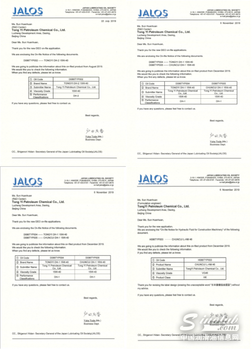 凭借强悍的性能,统一石化液压油连续获得多项国际标准组织认证,取得博世力士乐(BOSCH REXROTH)、JCMAS HK(日本建机协会)、Denison HF-0(丹尼逊)、Eaton(伊顿)、Cincinnati(辛辛那提)认证,能够满足全球主流液压泵的技术要求。同时,亲水型液压油C1,达到了卡特彼勒非道路设计标准。此外,统一石化旗下顶峰PEAK工程机械产品也获得沃尔沃原厂OEM认证。更值得一提的是,统一石化包括“CHUNCUI L-HM 46”“TONGYI DH-2 15W-40””TONGYI DH-1 15W-40”“CHUNCUI DH-1 15W-40”在内的多款产品获得日本汽车标准组织“JASO”认证。