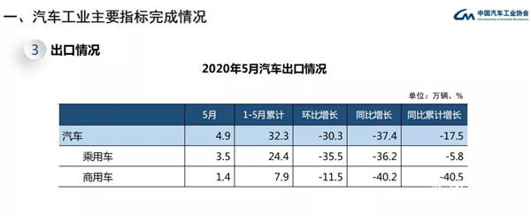 1~5月,汽车企业出口32.3万辆,同比下降17.5%。分车型看,乘用车出口24.4万辆,同比下降5.8%;商用车出口7.9万辆,同比下降40.5%。