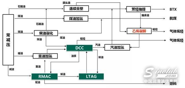 采用石科院炼油技术与蒸汽裂解组合流程加工高硫中间基原油,用减压渣油临氢热裂化(RMAC)技术代替原流程的焦化技术,解决了高硫石油焦无法完全自用和焦化污染的问题,催化裂解(DCC)技术可多产低碳烯烃,LTAG技术可有效调节柴汽比并可增产BTX芳烃。该组合流程不仅可通过蒸汽裂解原料轻质化,提高应对石油价格波动的能力,还具备按照市场需求调整汽柴油产品生产和化工原料生产的灵活性,从而发挥所有装置的最大效益。