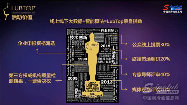 “LubTop总评榜”评选活动始于2013年,如今已是第七届,旨在“树立行业标杆,启迪行业未来”,引导润滑油产品和技术进步的方向。“LubTop2019总评榜”由中国润滑油信息网(www.sinolub.com)、《润滑油市场》杂志发起主办,法兰通联展览(北京)有限公司(AMR法兰克福北京展会主办方)联合主办,业内权威机构和众多主流媒体支持协办。通过总结过去一年润滑油行业以及汽车后市场在品牌、技术和产品方面取得的成就,记录产业技术和商业模式创新的足迹,让渠道终端和消费者更客观了解行业的品牌发展情况,为用户的消费行为提供科学的决策依据。