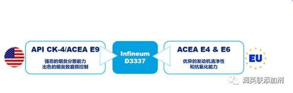 润英联凭借独有的水杨酸盐清净剂专利技术,成功开发了顶级中灰产品平台Infineum D3337,可以同时满足北美API CK-4/FA-4及欧洲ACEA E4/E6/E7/E9-16规格要求,并获得全球大量主机厂认证(如戴姆勒、沃尔沃、斯堪尼亚、MAN、康明斯等),具有超越客户期待的性能表现。