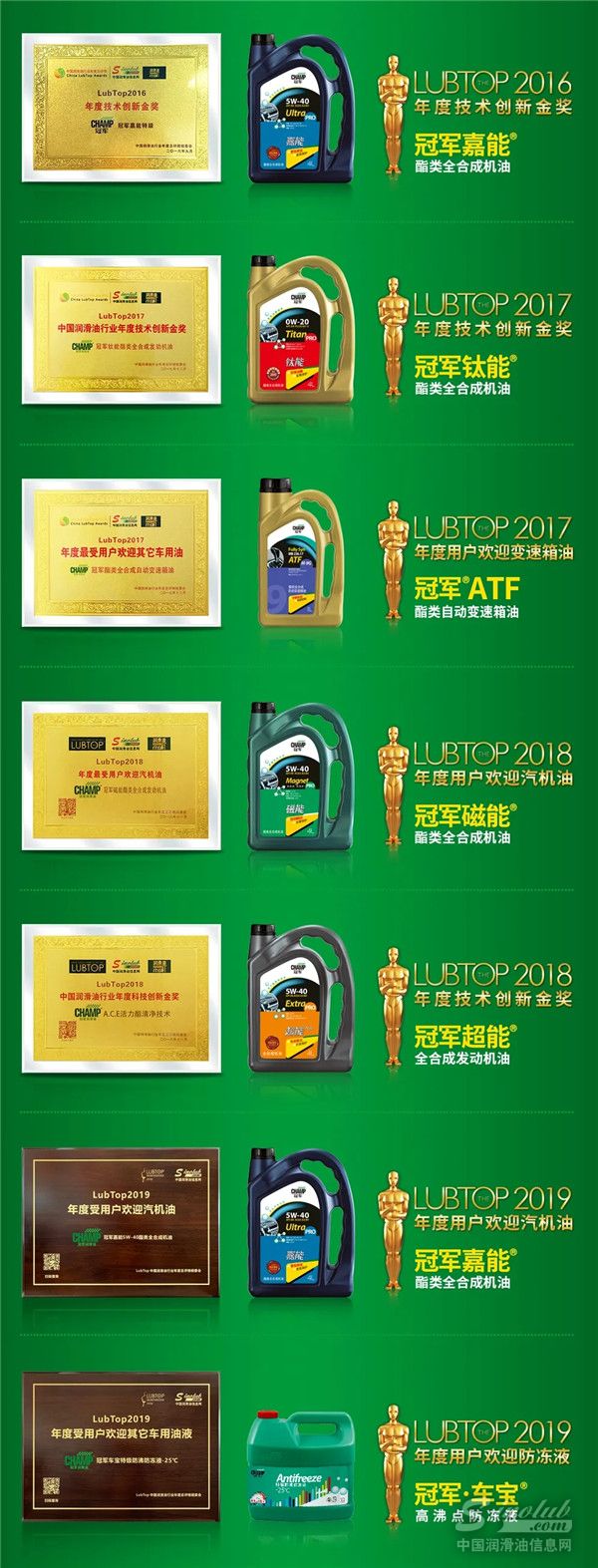 2020年7月20日,有中国润滑油行业“奥斯卡”之称的“LubTop2019中国润滑油行业年度总评榜”颁奖盛典云端全球发布。冠军®凭借技术创新、市场表现和用户满意度等多方面的卓越表现,再次获得“LubTop2019年度用户欢迎汽机油”和“LubTop2019年度用户欢迎防冻液”两项年度大奖。
