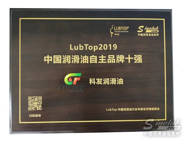 科发润滑油斩获“LubTop2019中国润滑油自主品牌十强”