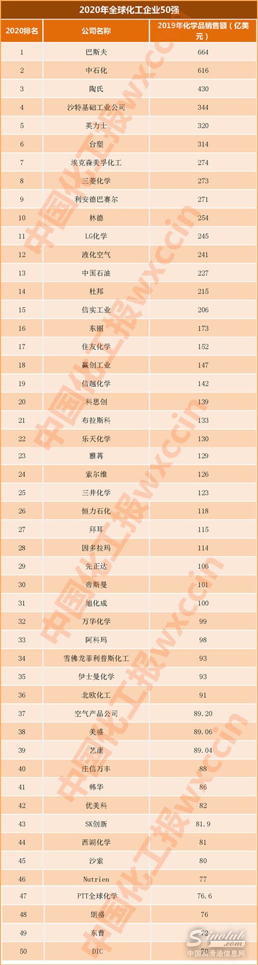 2020全球化工50强:巴斯夫夺魁,中石化斩获亚军,中石油、恒力、万华上榜