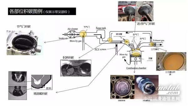 一般出现在节气门、进气歧管、进排气门、气门连杆、喷油嘴、燃烧室等部位的积碳,最为常见。