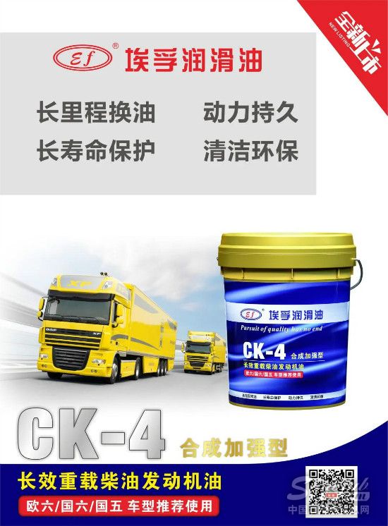 随着时间的发展,API CK-4润滑油也成为了重型柴油发动机机油的标杆产品。顺应市场需求,埃孚也重磅推出了新一代CK-4级别商用车柴油机油。据介绍,凝聚埃孚核心技术,新一代CK-4产品涵盖6万公里、10万公里和15万公里换油里程产品系列,使用合成基础油与长里程添加剂技术配方,以技术领先、性能持久、省心省钱的润滑油解决方案,全面满足最新国六要求的各种商用车型应用要求。其更好的抗高温性能和抗氧化能力,能够有效减少机油消耗;优异的粘度稳定性,在严苛工况条件下保障发动机运转持续强劲;卓越的清净分散性,在长换油周期内能有效抑制油泥和积炭的生成,始终保持发动机内部的洁净如新。