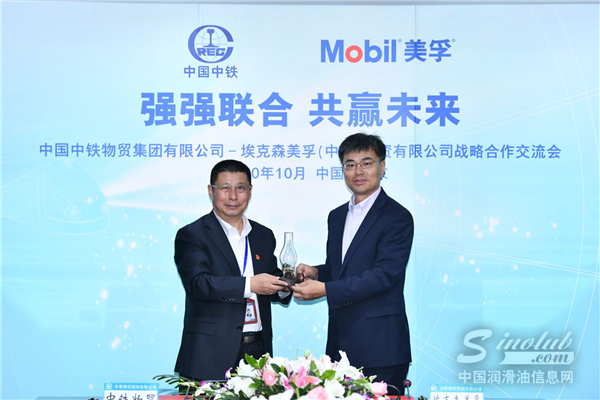 中铁物贸集团有限公司总经理黄怀朋先生(左)与埃克森美孚(中国)投资有限公司总经理兼董事岳春阳先生(右)交换纪念品