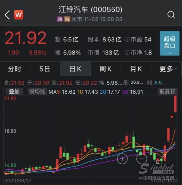 11月2日,A股汽车板块大涨,其中热门股江铃汽车再度涨停,这也是该股连续四个交易日吃下第三个涨停板。