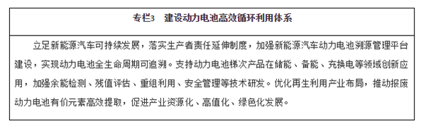 推动动力电池全价值链发展。鼓励企业提高锂、镍、钴、铂等关键资源保障能力。建立健全动力电池模块化标准体系,加快突破关键制造装备,提高工艺水平和生产效率。完善动力电池回收、梯级利用和再资源化的循环利用体系,鼓励共建共用回收渠道。建立健全动力电池运输仓储、维修保养、安全检验、退役退出、回收利用等环节管理制度,加强全生命周期监管。