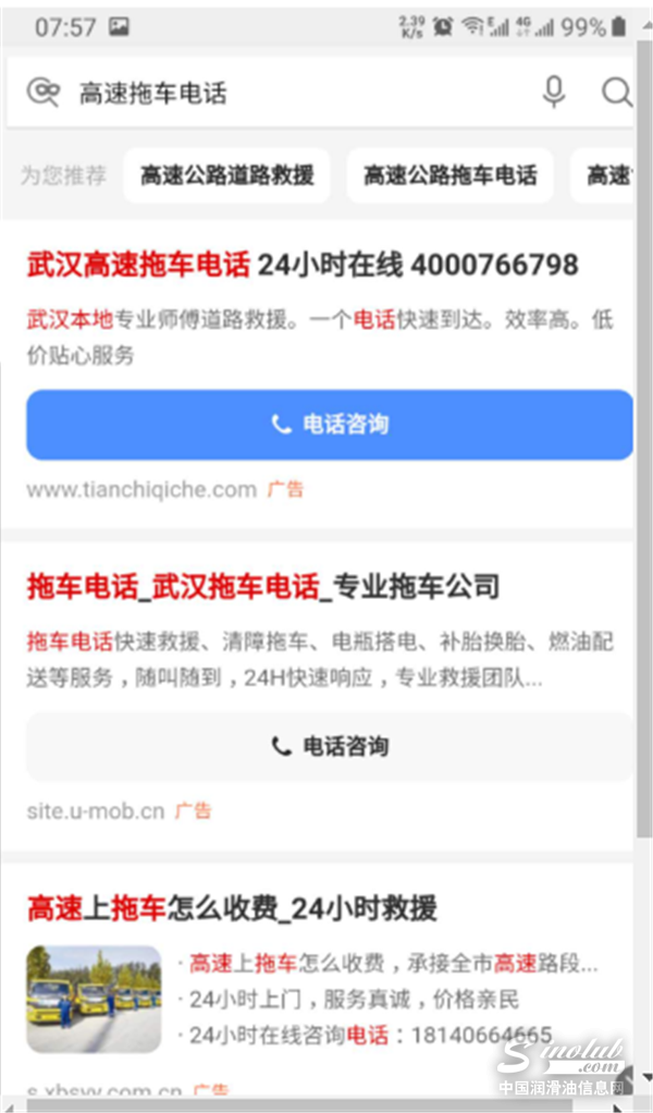 为证实陈师傅的说法,10月30日,记者联系了另一位被骗司机张师傅,与麻城当地一家负责麻武高速救援的合法公司,一同来到了沪蓉高速麻武段。张师傅在搜索引擎中输入“高速救援电话”,页面跳转后显示的靠前搜索结果都是以“400”开头的拖车电话,张师傅随机挑选一个拨打,还原了当天他被困求援的场景: