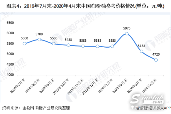 据金投网数据显示,2019年下半年,我国润滑油参考价维持在5383-5700元/吨之间,价格较为稳定。2020年1-4月,受新型冠状肺炎疫情影响,润滑油价格下滑,2020年4月末,润滑油参考价为4720元吨。