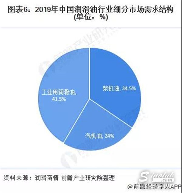 2019年,车用润滑油约占润滑油消费总量的58.5%,工业润滑油约占润滑油消费总量的41.5%。车用润滑油的细分产品中,柴机油需求占润滑油比约34.5%,汽机油需求占比约24%。