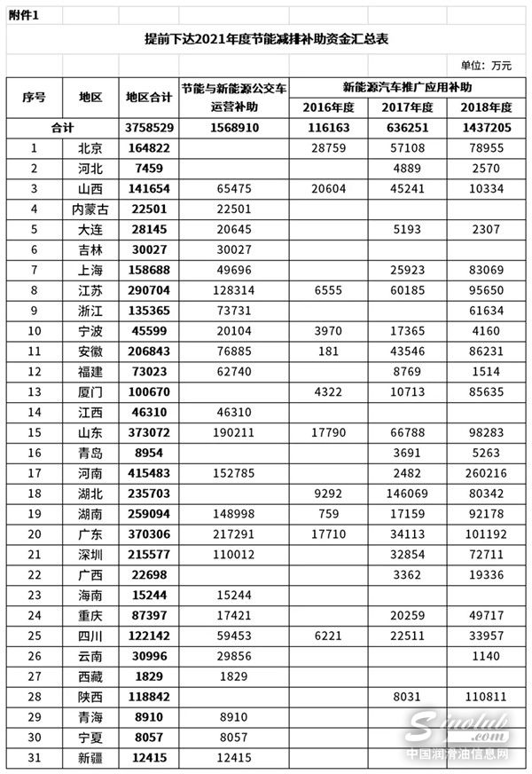 近日,由国家财务部官网获悉,国家财务部已于日前发布《财政部关于提前下达2021年节能减排补助资金预算(第一批)的通知》(以下简称为《通知》)。据附件显示,2021年共安排新能源汽车补贴375.8529亿元,其中新能源公交车运营补助156.8...