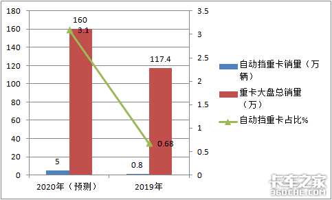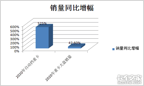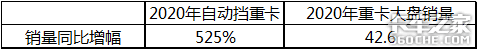 上图表数据反映出两个信息:一是自动挡重卡占比目前只有3%,虽然同比占比增加2.3个百分点,但相对重卡整体市场来说市场份额仍然很小;二是2020年自动挡重卡销量相对2019年同比大涨525%,增速远远大于重卡整体市场42.6%增幅,自动挡重卡正呈现快速增长态势。