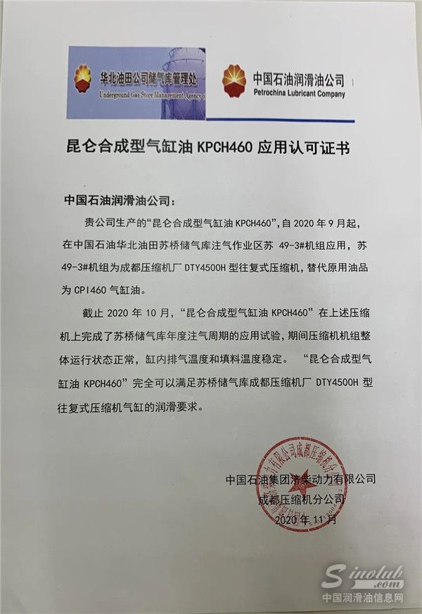2020年11月,昆仑润滑北京润滑油销售分公司与大连研发中心、产品设计中心共同努力,昆仑高压合成型往复式天然气压缩机气缸润滑油KPCH460,获得了中国石油集团济柴动力有限公司成都压缩机分公司的“DTY4500H型往复式压缩机”设备用油认可证书。这也是昆仑气缸油首次取得设备厂家出具的正式认可证明。