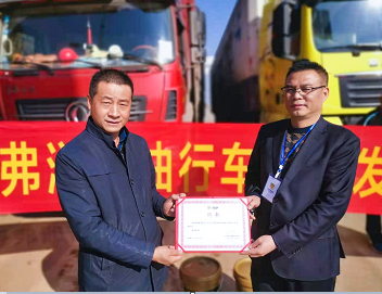 云南重卡司机罗师傅和张师傅一直在使用丹弗生物基润滑油,对丹弗产品非常认可和信赖,特邀他们来到行车试验的发车仪式现场,颁发了“最美卡友司机”荣誉证书,并分别赠送1桶18L柴机油、旅行包和水杯等奖品,感谢他们对丹弗润滑油长期的信赖和支持。