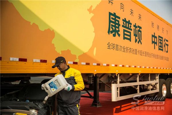 随着主持人宣布换油仪式开始,专业的重卡保养技师将全车油液放出,并更换康普顿全系油液产品。
