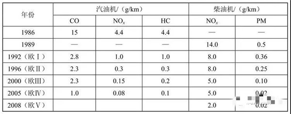 欧盟自1988年以88/77/E1~C指令控制总重3.5t以上柴油车排气污染物,分阶段实施欧Ⅰ和欧Ⅱ标准,2000年开始分阶段实施欧Ⅲ和欧Ⅳ标准,2009年实施最新的欧Ⅴ标准。欧Ⅴ指标的目标是使柴油车PM排放量比欧Ⅳ指令减少80%,NOx减少20%;汽油车NOx和HC排放量各减少25%。