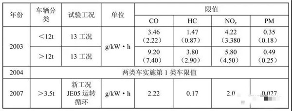 美国分别于2004和2007年作了两次调整,其排放限制更趋于严格,2011~2013年美国联邦重型柴油汽车PM限制将加严为0.01~0.02g/ps·h,NOx限制将加严为0.3g/ps·h。对于重型公路车辆及其发动机,美国联邦目前实施的排放要求是2007及以后车型年阶段的要求。