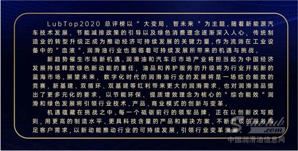 LubTop年度总评榜已成为润滑油和汽车后市场行业极具规模和影响力的全国性评选活动,被业界广泛认为是由国际巨头领衔、中国知名自主品牌共同参与并实现跨界融合的润滑油行业“年度奥斯卡”,是品牌品质和行业地位的权威背书。