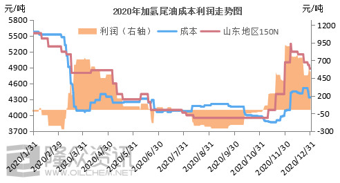 【49.79%】 2020年加氢尾油利润值最低达-262元/吨,均值122元/吨,同比去年均值下滑49.79%