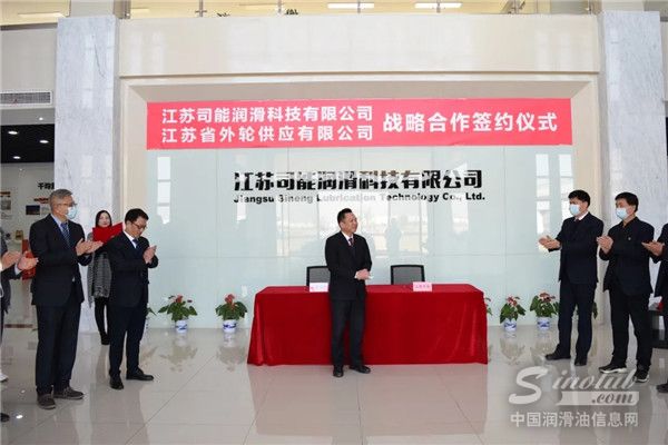 2021年1月12日上午,江苏司能润滑科技有限公司与江苏省外轮供应有限公司正式签订战略合作协议,双方将共同推动润滑油在港口机械和船舶领域的全面发展。司能石油化工有限公司常务副总、江苏司能润滑科技有限公司总经理吴土金,司能石油化工有限公司副总经理、总工程师吴宪,江苏省外轮供应有限公司董事长、总经理孙继强,副总经理沈永保等领导嘉宾出席了签约仪式。