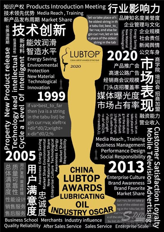 面对市场变化和行业发展,LubTop总评榜活动也在力求与时俱进。今年,面对双基建、双循环、新能源和大数据带来的新机遇,LubTop总评榜对评选奖项和评选机制进行了全面升级。除了延续第三方权威机构质量检测结果(一票否决权)、线上用户投票(占比 30%)、专业市场调研(占比 20%)、专家导师团评审(占比 40%)、媒体观察评议(占比 10%)流程之外,今年将由线上线下大数据+AI智能算法来产生最终的 LubTop 品牌荣誉指数。