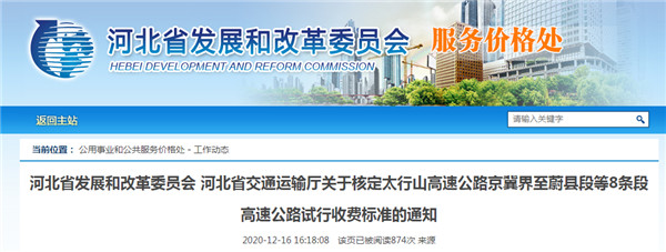日前,河北省发展和改革委员会、河北省交通运输厅发布了关于核定太行山高速公路京冀界至蔚县段等8条段高速公路试行收费标准的通知。