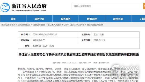 近日,浙江省人民政府办公厅印发《关于继续执行我省高速公路车辆通行费部分优惠政策有关事宜的复函》,同意对2020年底到期的高速公路车辆通行费优惠政策予以继续执行。