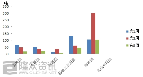 本周防冻液询单量102.1吨、其他工业用油询单量44.7吨、液压油19.3吨、齿轮油17.6吨,润滑脂7.8吨、没有其他车用油的采购量。