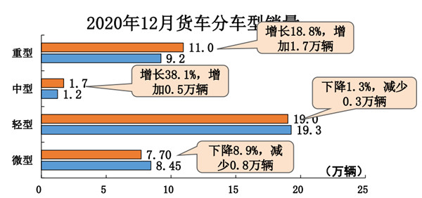 此前,据中汽协线上发布提供的数据显示,2020年,货车产销数据分别为477.8万辆和468.5万辆,其中产量同比增长22.9%,销量同比增长21.7%。而备受货车司机群体关注的重卡销售方面,重型货车全年销量161.7万辆,同比上升37.7%。