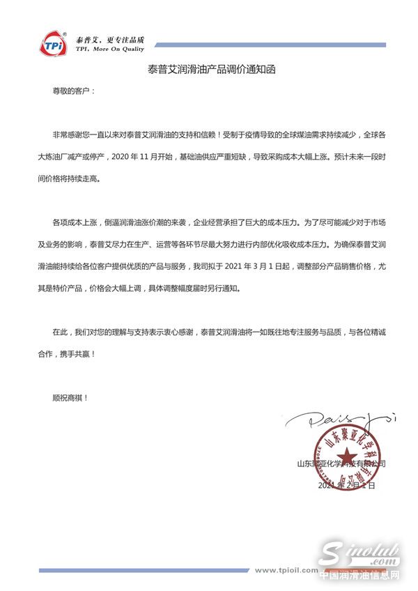 为确保泰普艾润滑油能持续给各位客户提供优质的产品与服务,我司拟于2021年3月1日起,调整部分产品销售价格,尤其是特价产品,价格会大幅上调,具体调整幅度届时另行通知。
