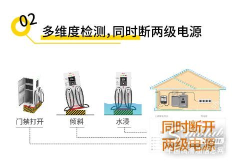 充电设备采用倾倒、门禁、水浸等多维度监测,在出现异常时可同时断开两级电源,确保用户人身安全。
