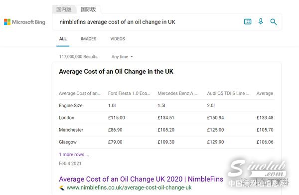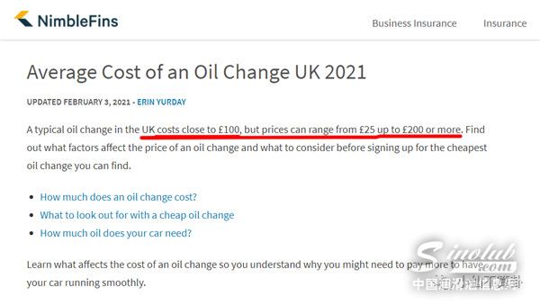 我们来看下在英国换一次机油到底需要多少钱,以及有哪些费用。在bing里如上图搜索。你将看到一家叫NimbleFins英国的保险公司在2021年1月公布的统计数据。