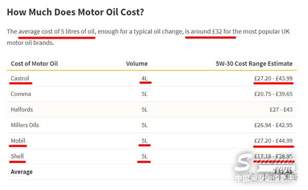 表格中列出了几种英国常见机油在修理厂的零售价格区间。5升机油的平均价格大约是32英镑(284.8RMB)。