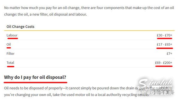 上图给出了解释。英国换油收取的工时费在30-70+英镑之间,机油价格只有17-65+磅,机滤7英镑,看到这里已经得出了解释,换油的工时费甚至高于机油价格本身。所以才会使得平均换油价格如此高昂。