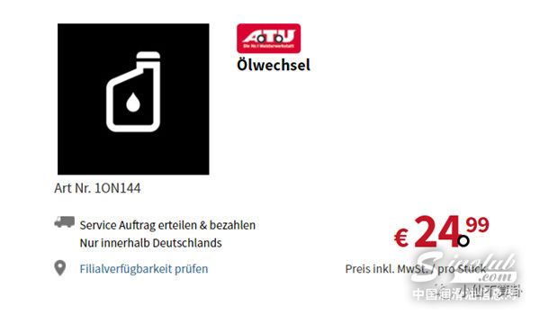 自营品牌价格30欧元(5升),工时费 24.99欧元。显然这个工时费是高于德国平均水平的,但ATU是相当有知名度的连锁,所以贵一些也不奇怪。24.99欧元相当于195RMB。