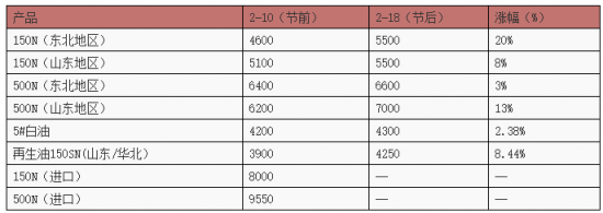 进口油:春节前亚洲炼厂整体供应持续紧缺,受下游润滑油厂商刚需,进口一、二类外盘价格再涨。国内市场500N价格在9550元/吨,150N价格8000元/吨。虽市场货源有限,现货供应紧张,但受春节假期影响,终端需求下滑,市场购买力度减弱,因此市场行情波动有限,稳为主。节后,原油利好,同时进口商及贸易商手中货源有限,价格呈现涨势,但因市场行情在假期期间波动幅度较大,业者多持观望态势,截至2月18日,多数产品型号暂无报价,加之部分企业暂未复工,市场价格多在商议中。