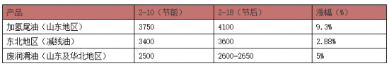 春节假期前加氢尾油市场基本稳中小调,受国际油价利好消息的影响,部分炼厂价格小幅调涨500-100元/吨,但多少下游企业年前备货已基本完成,上下游市场暂处平缓阶段,市场行情变化不大。假期间国际原油持续上涨,业者对节后市场看涨浓厚,但春节休假,下游开工企业较少,市场价格调整变化不大。目前部分炼厂已入市开工,受原油利好消息刺激,提振业者心态,山东、华北地区主流炼厂普涨300-400元/吨。