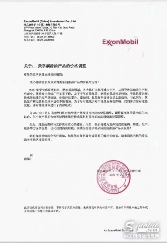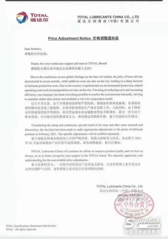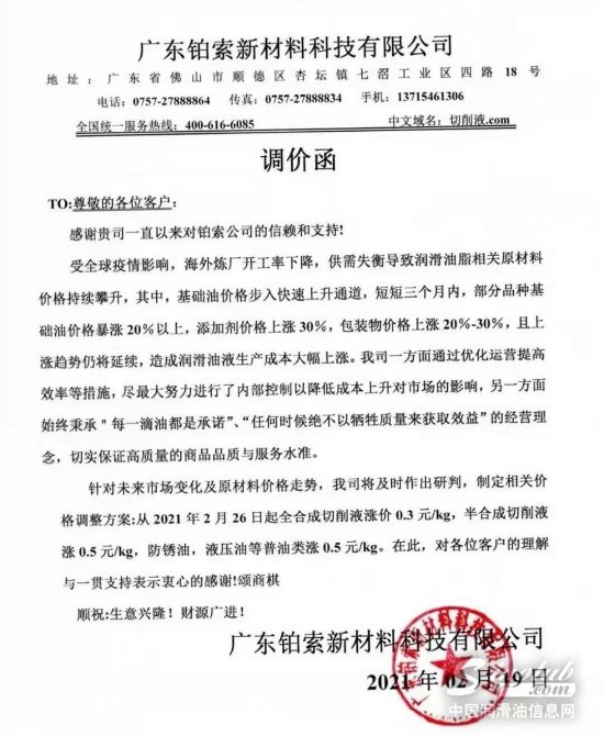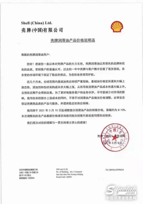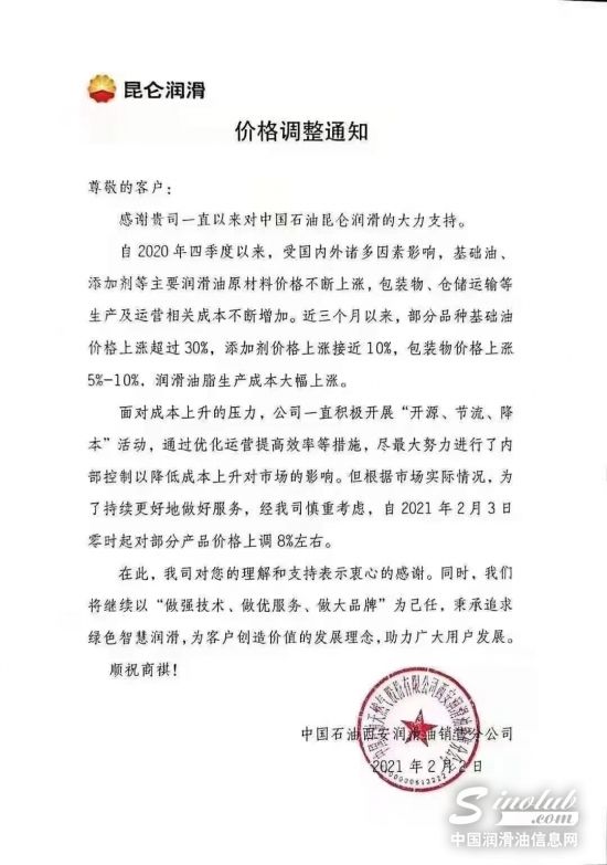国际原油价格延续涨势,创出近一年新高。受上游原油、基础油及包装材料等原材料价格波动影响,一些年前尚未上调价格的润滑油厂家年后也纷纷发出了涨价函。