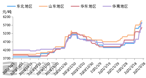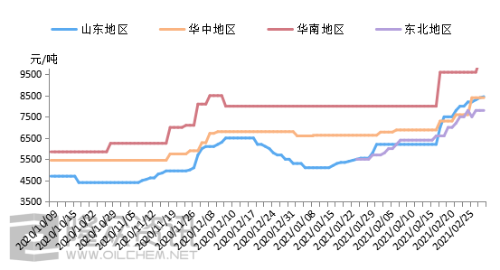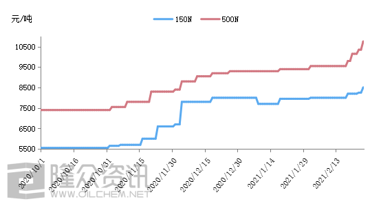 隆众数据显示,从2020年10月到2021年3月期间,基础油低粘度价格平均上涨1200-1500元/吨,高粘度资源价格平均上涨3000-3500元/吨。上涨原因前期具体分析过,主要受进口资源进口量锐减的原因支撑国内资源的消耗,另外受国际油价震荡上行的原因,导致生产成本水涨船高。