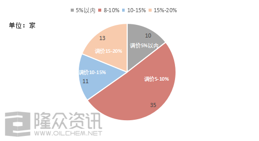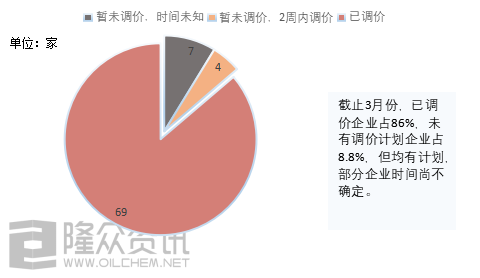 隆众调研数据显示,80家企业中有69家企业已经确定调价。有11家企业暂时未调价,部分企业计划在2周内进行调价。