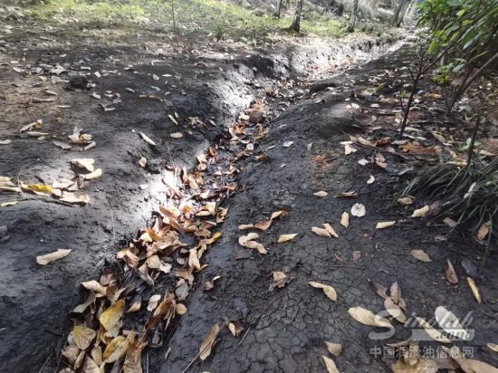 这是“新华视点”记者近期在沿江城市武汉东湖新技术开发区武大园路东风鸿泰汽车城旁边的绿化带看到的情形。工作人员称,废油输送管道老化、破裂,泄漏造成污染。