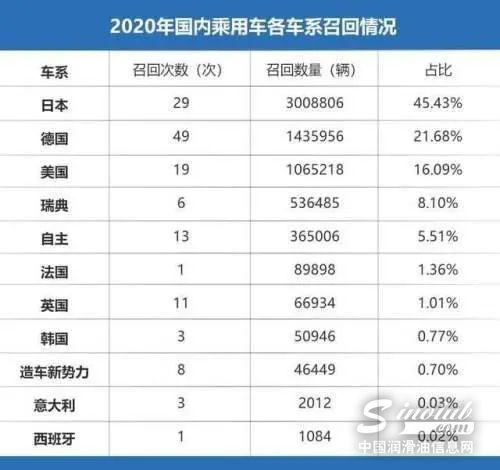 整理 2020 年召回数据显示,日系品牌 2020 年累计召回 3008806 辆车,占据全年召回总量 45.43%;包含 BBA 在内的德系品牌累计发布 49 次召回公告,共召回 1435956 辆,其中奔驰和宝马是榜单中召回次数超过 10 次的品牌;美系品牌共召回汽车 1065218 辆,占比 16.09%;自主品牌共发起 13 次召回,累计召回 365006 辆,法系、韩系等其他品牌召回的占比不足 4%。