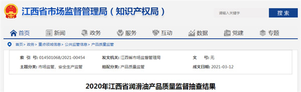 江西省市场监督管理局:1批次润滑油产品抽查不合格
