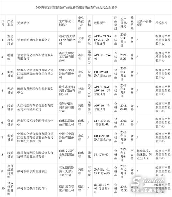 近日,江西省市场监督管理局公布2020年江西省润滑油产品质量监督抽查结果。本次抽查了10批次润滑油产品,经检验,不合格产品1批次,不合格发现率为10%。