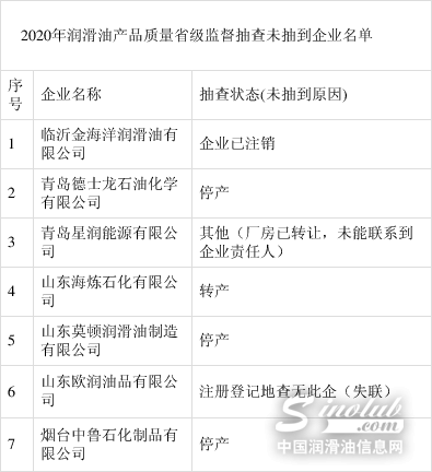 2021年3月19日,山东省市场监督管理局网站公布2020年润滑油产品质量省级监督抽查结果。本次共抽查了全省41家企业生产/销售的61批次润滑油产品,其中,生产领域38家企业57批次,流通领域3家企业4批次。发现4批次产品不符合相关标准的要求,不合格项目为低温动力黏度、泡沫性项目。