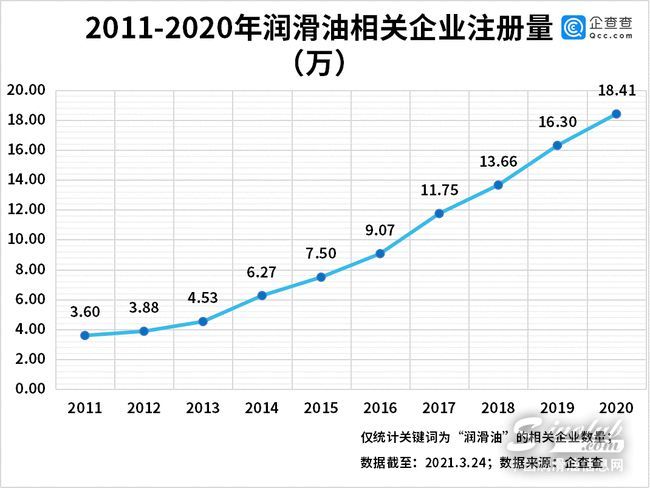 从近十年来的行业变化来看,企查查数据显示,润滑油相关企业注册量呈逐年增长趋势,2017年首次突破10万家,达到11.75万家,2020年全年注册量为18.41万家,同比增长12.9%。