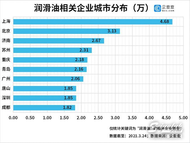 从城市分布来看,企查查数据显示,上海以4.68万家润滑油相关企业排名榜首,北京共有3.13万家,位居第二。济南、苏州、重庆、青岛、广州等城市同样跻身前十。